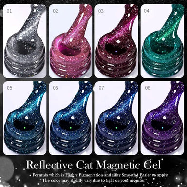 Amazing Reflective Glitter Cat Eye Magnetic Gel Colours. Bright effect in the dark.Size: 7ml Bottle Colour / Image / Description Disclaimer