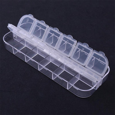 12 Compartments Clear Plastic Storage Box. Size: Long: 13cm - Width: 5cm - Height: 1.1cm Compartment size: 1.6x1.6cm