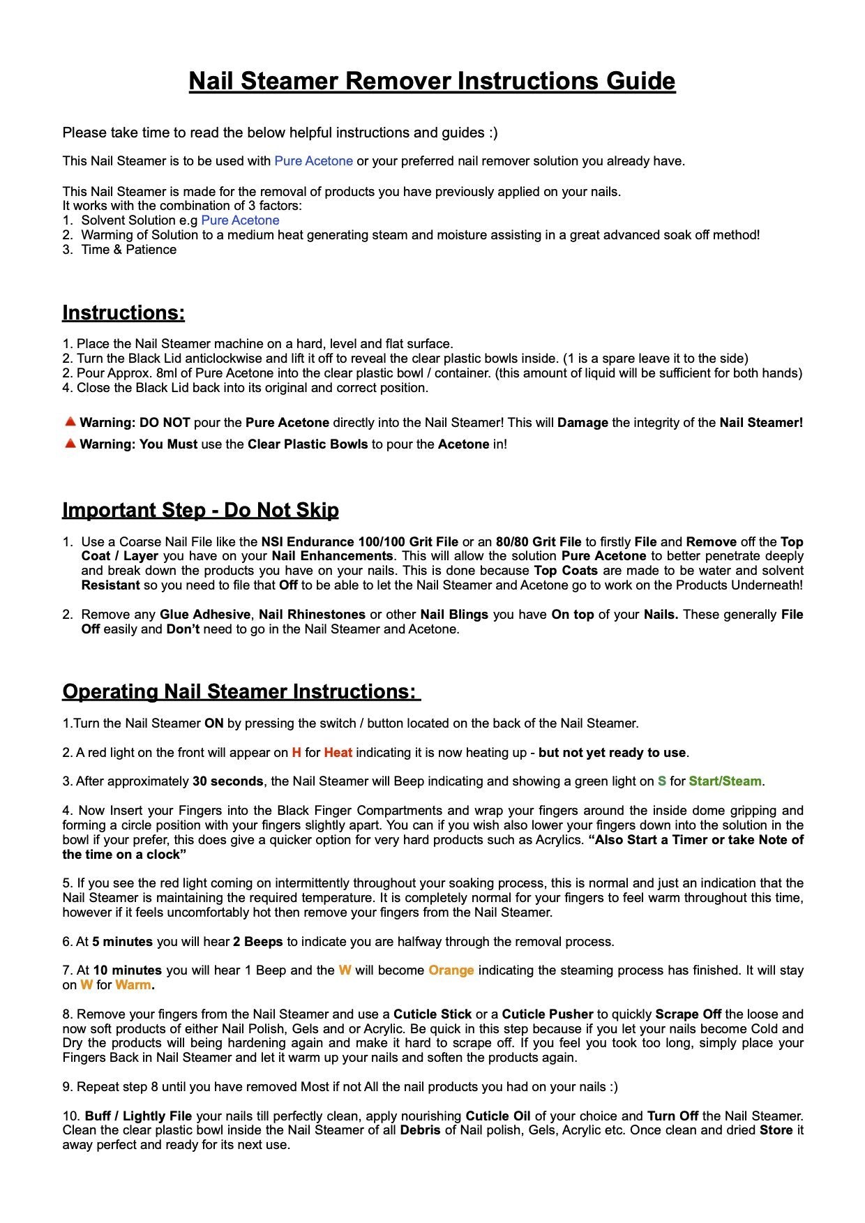 Click Here is a link on the Nail Steamer Brochure Step by Step Guide: