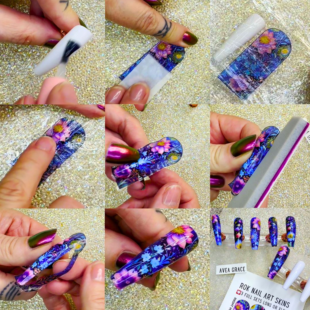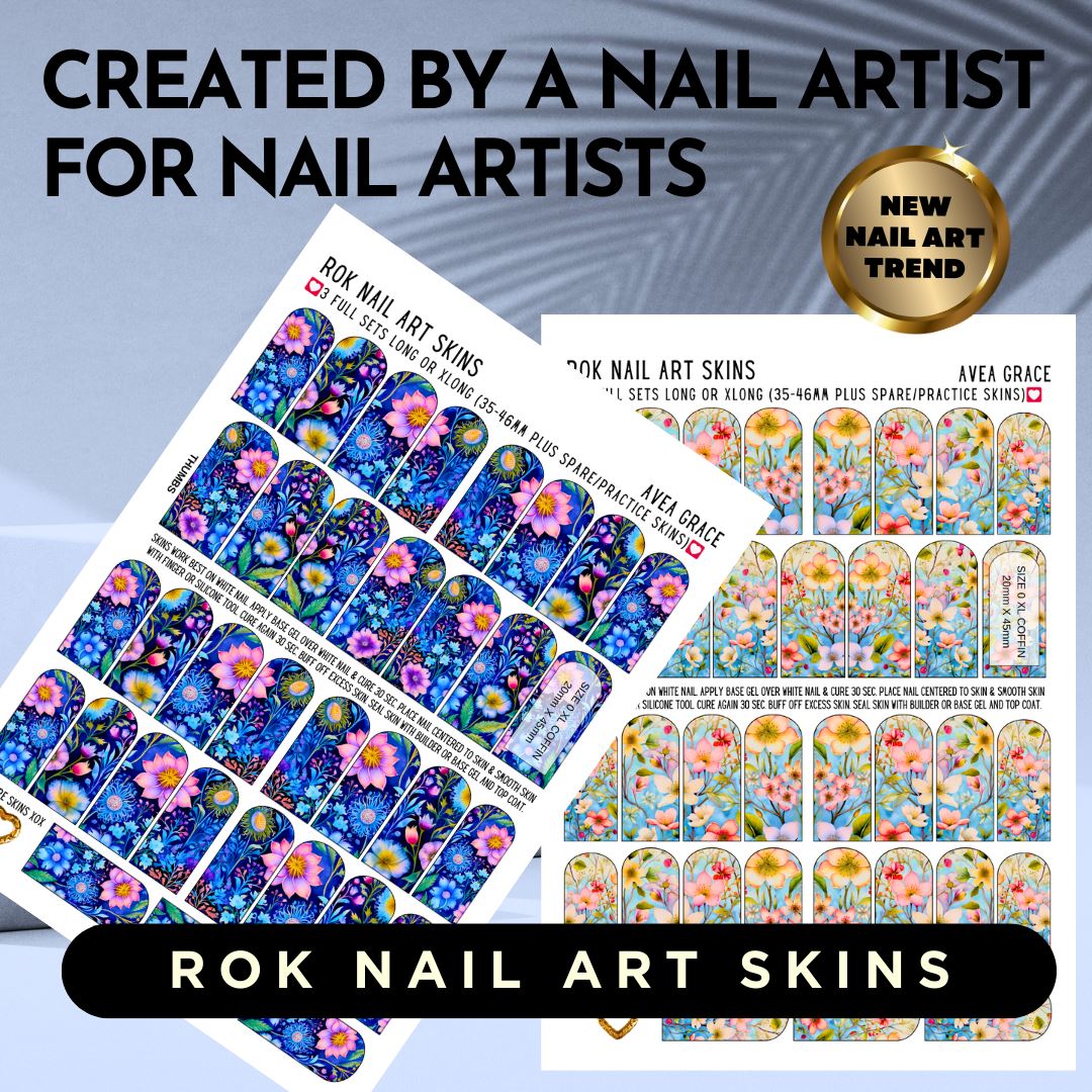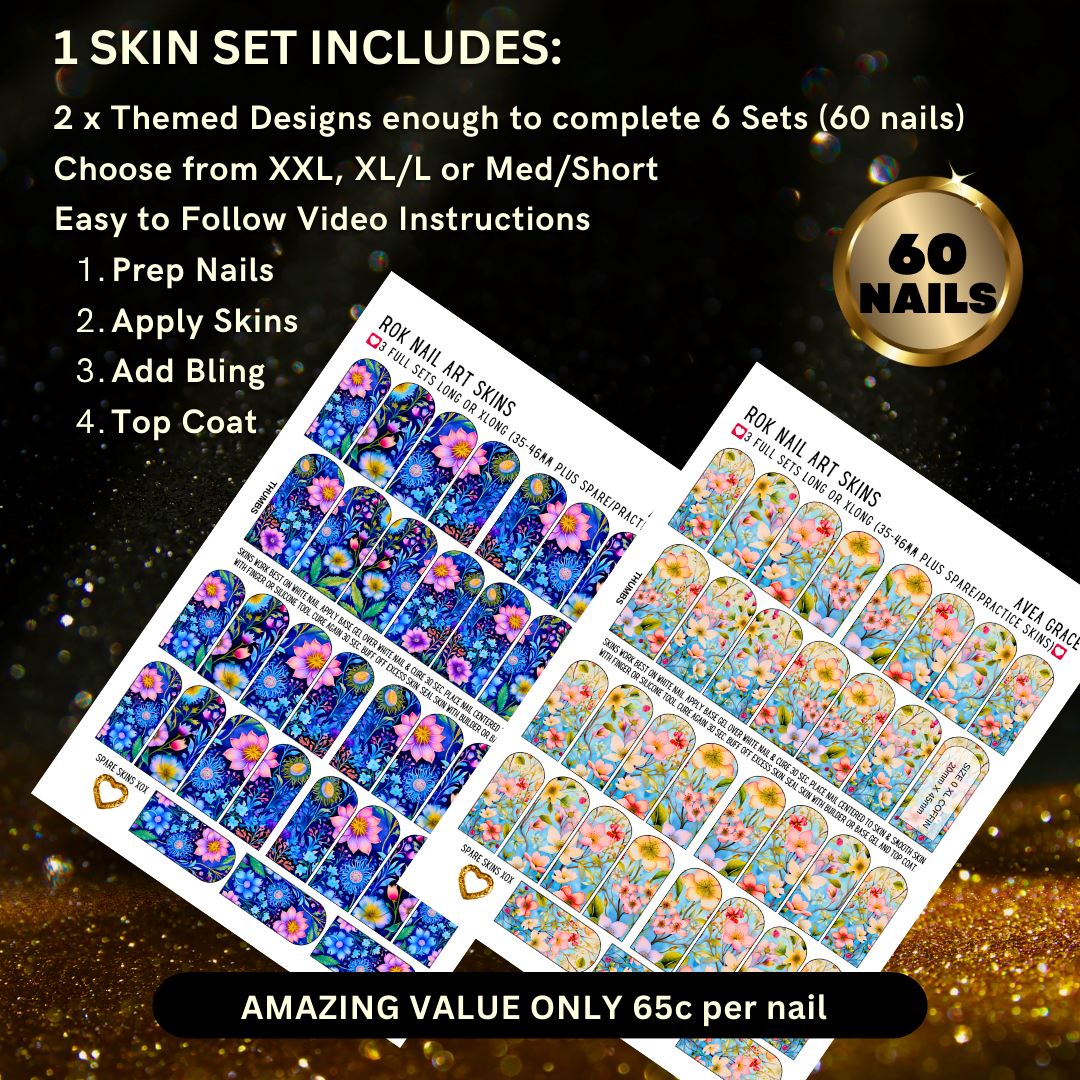 Create pro level nail art with our hot new product from ROK NAIL ART SKINS. Each skin set includes 2 gorgeous, themed designs with enough skins to complete 6 full sets of nails (60 nail skins - only 65c per nail!!)