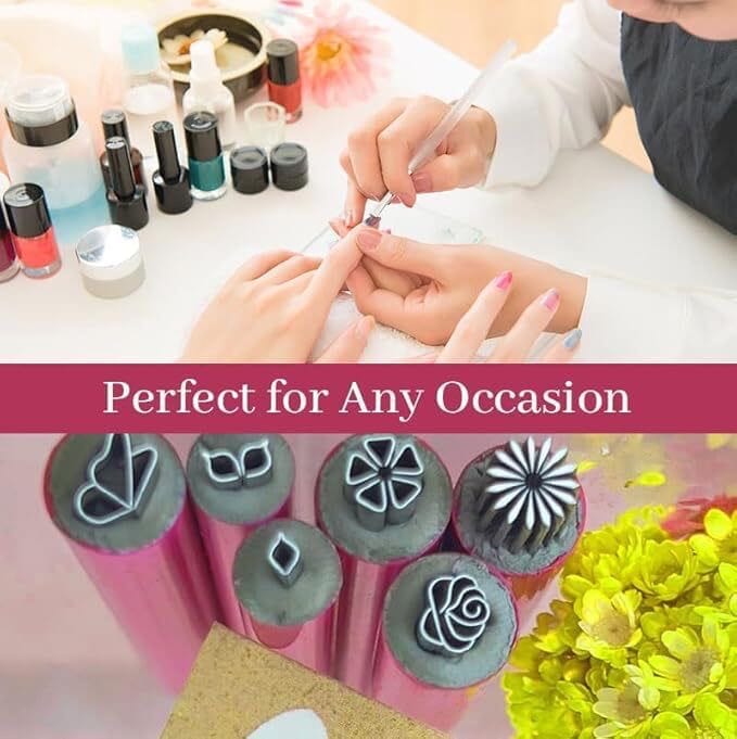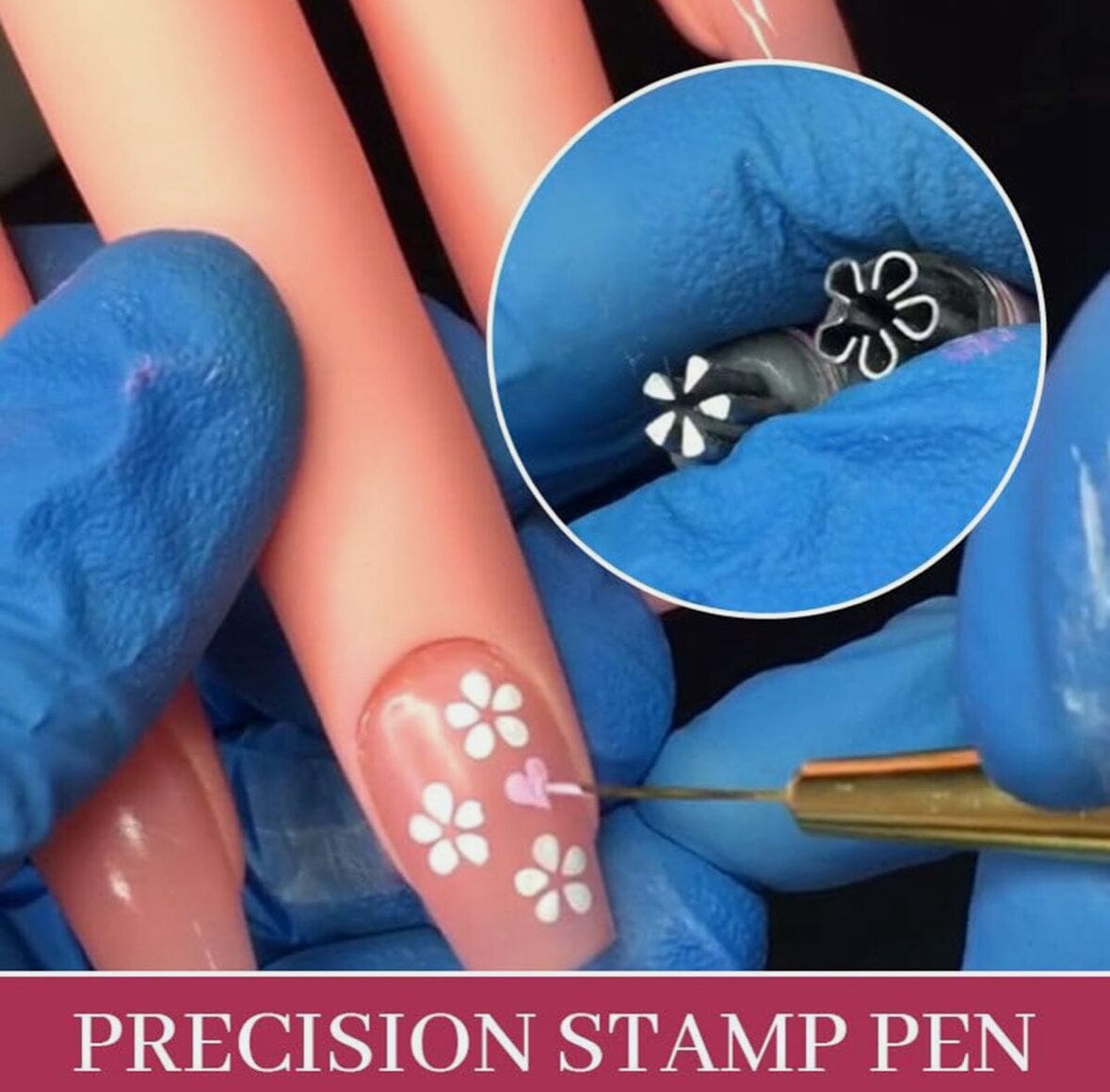 The Nail Art Pattern Design Metal Tool Set for stamping gel polish designs onto nails. Enhance your nail art with ease and accuracy using this essential metal stamping pen.