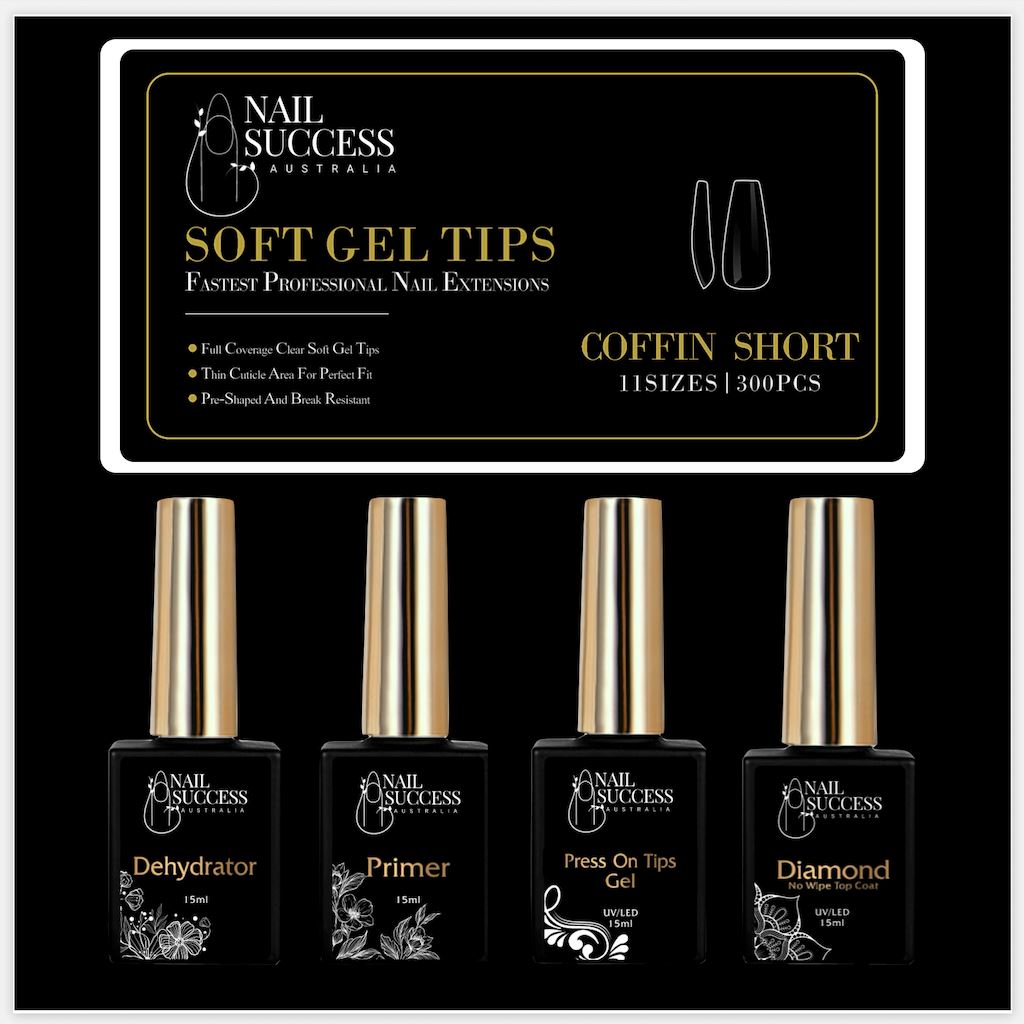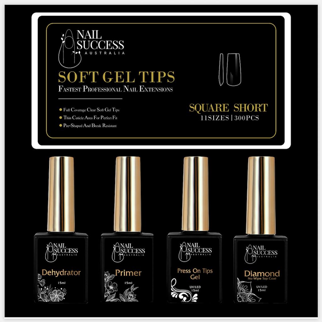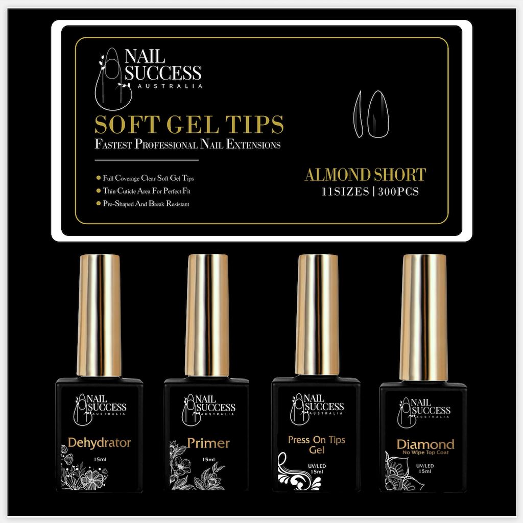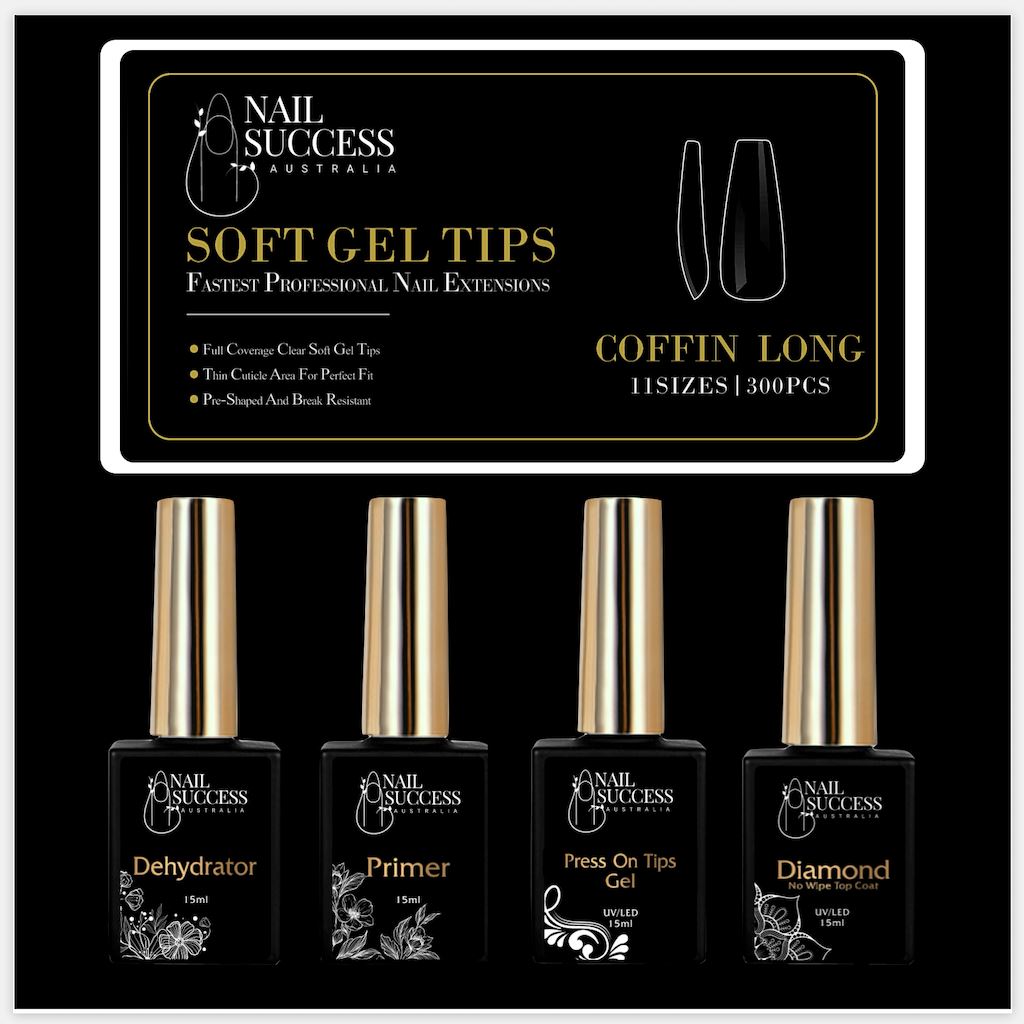 The NSI Australia Soft Gel Press On Nail Kit is perfect for creating easy nail extensions. It includes everything you need, you just must have a Nail Lamp that cures Gels and or Gel Polishes. The Kit includes the Soft Gel Press On Tips which are already shaped and ready to use as well as the 4 Gel Bottle System to get perfect long nail extensions that last 4 weeks! No lifting and no chipping.