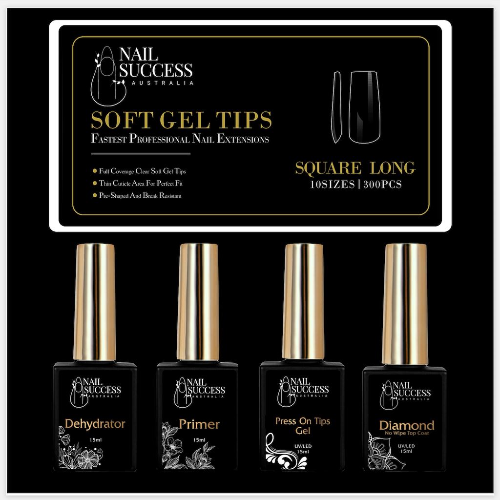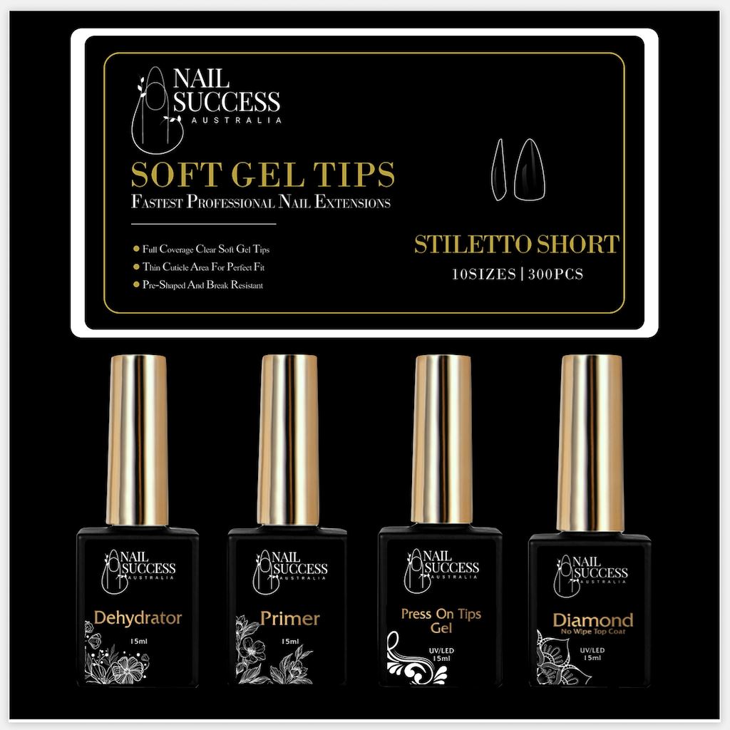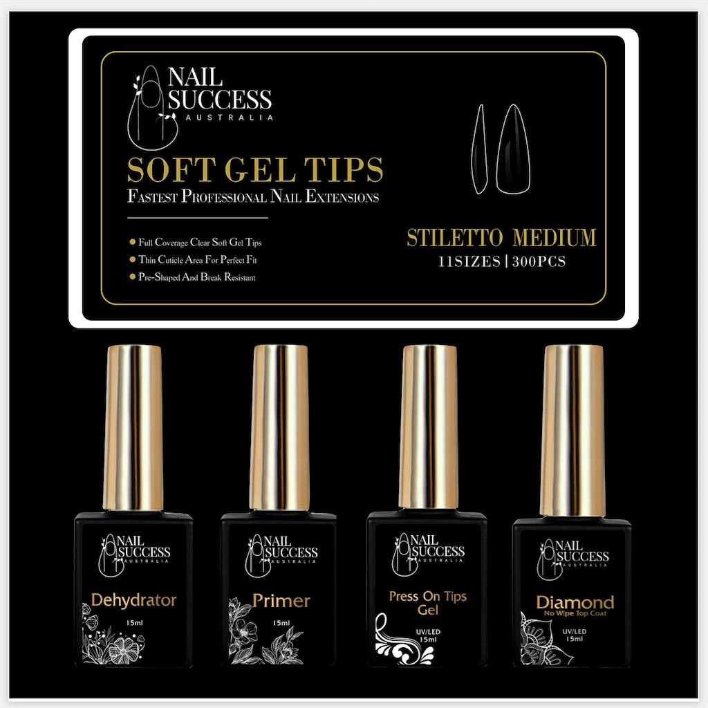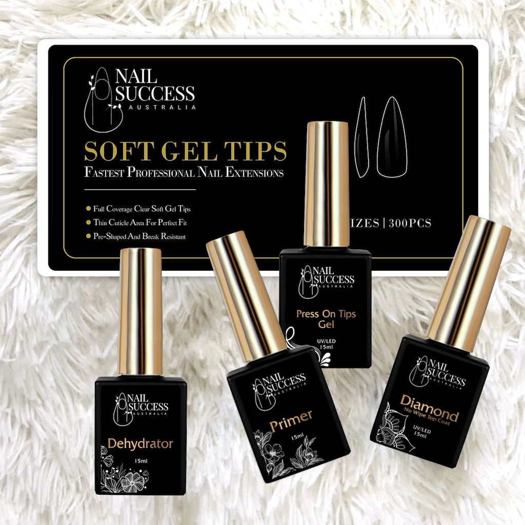 The NSI Australia Soft Gel Press On Nail Kit is perfect for creating easy nail extensions. It includes everything you need, you just must have a Nail Lamp that cures Gels and or Gel Polishes. The Kit includes the Soft Gel Press On Tips which are already shaped and ready to use as well as the 4 Gel Bottle System to get perfect long nail extensions that last 4 weeks! No lifting and no chipping.