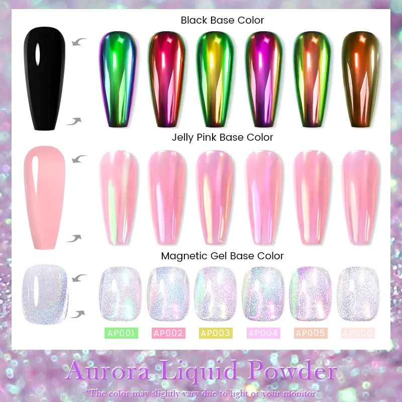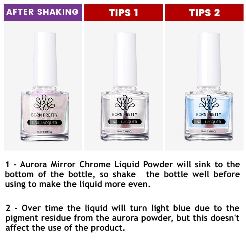 1: Chrome Aurora Nail Polish will have particles sink to the bottom of the bottle when not being used, so shake the bottle well before using.