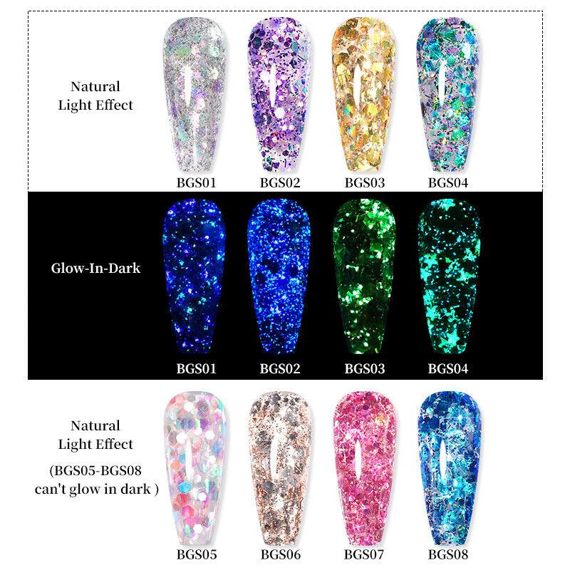 8 Colours To Choose From, All Super Bright And Shiny with 4 Colours Glow In The Dark (BGS01 to BGS04).