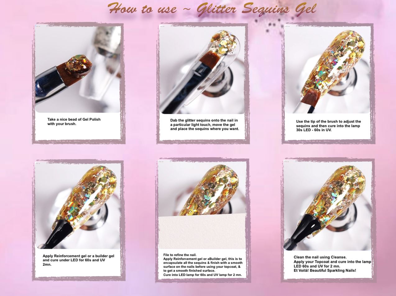 Take a nice bead of Gel Polish with your brush. Dab the glitter sequins onto the nail in a particular light touch, move the gel and place the sequins where you want. Use the tip of the brush to adjust the sequins and then cure into the lamp 30s LED - 60s in UV. Apply Reinforcement Gel or a Builder Gel, this is to encapsulate all the sequins & finish with a smooth surface on the nails before using your topcoat, and to get a smooth finished surface. Cure into LED Lamp for 60s and UV Lamp for 2mn. Clean the nail using Cleanse. Apply your topcoat and cure into the lamp LED 60s and UV for 2mn. Et Voilå! Beautiful sparkling nails!