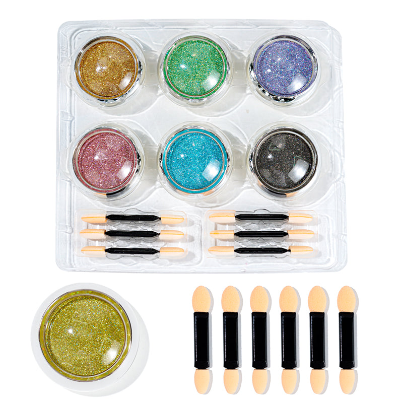 6 Individual colours and 6 applicator brushes. Very easy to use.Endless possibilities with different coloured backgrounds, the effects will always be different.