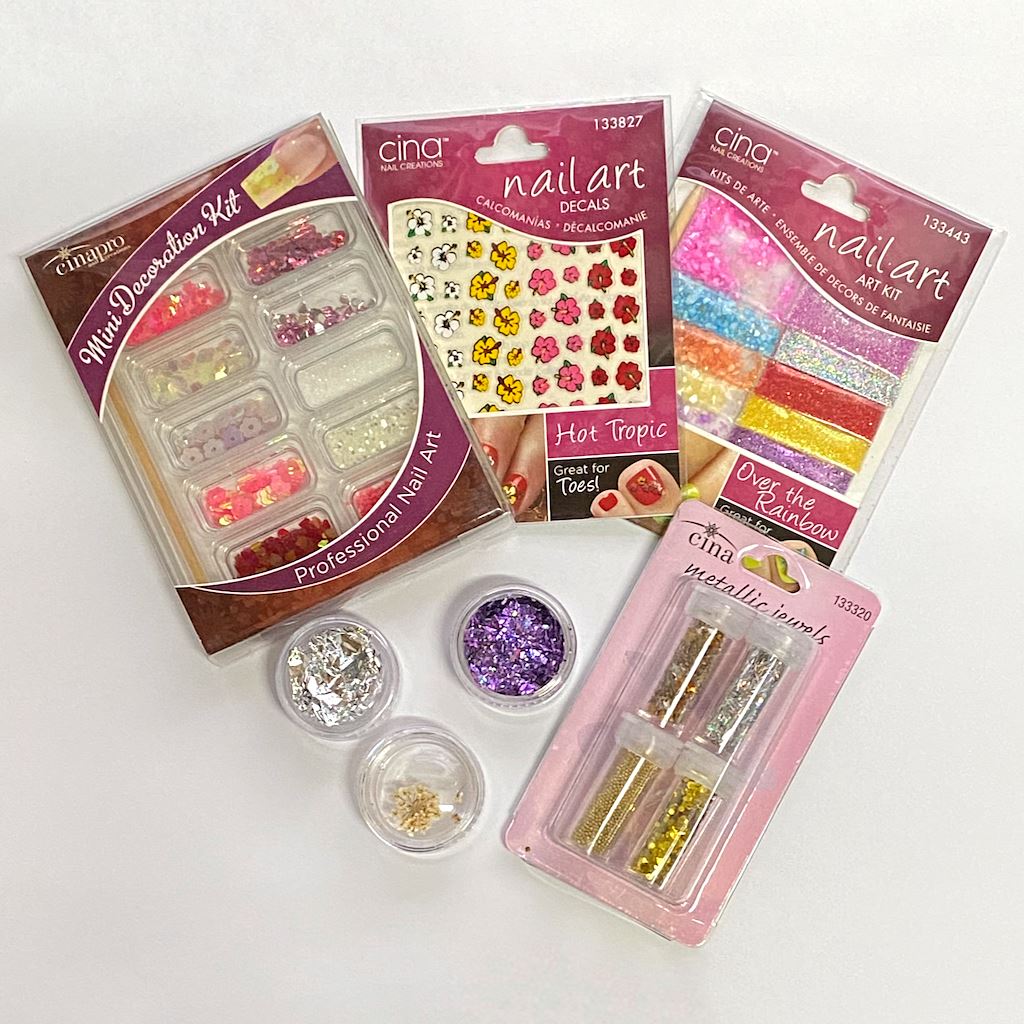 If you’re eager to experiment with various styles, we have nail art kits with four different kinds of gems and stickers to choose from. Add a wash of shimmer with vibrant foils, decorate your nails with tiny blue flowers or apply a baby pink polish with cute black and white stickers.