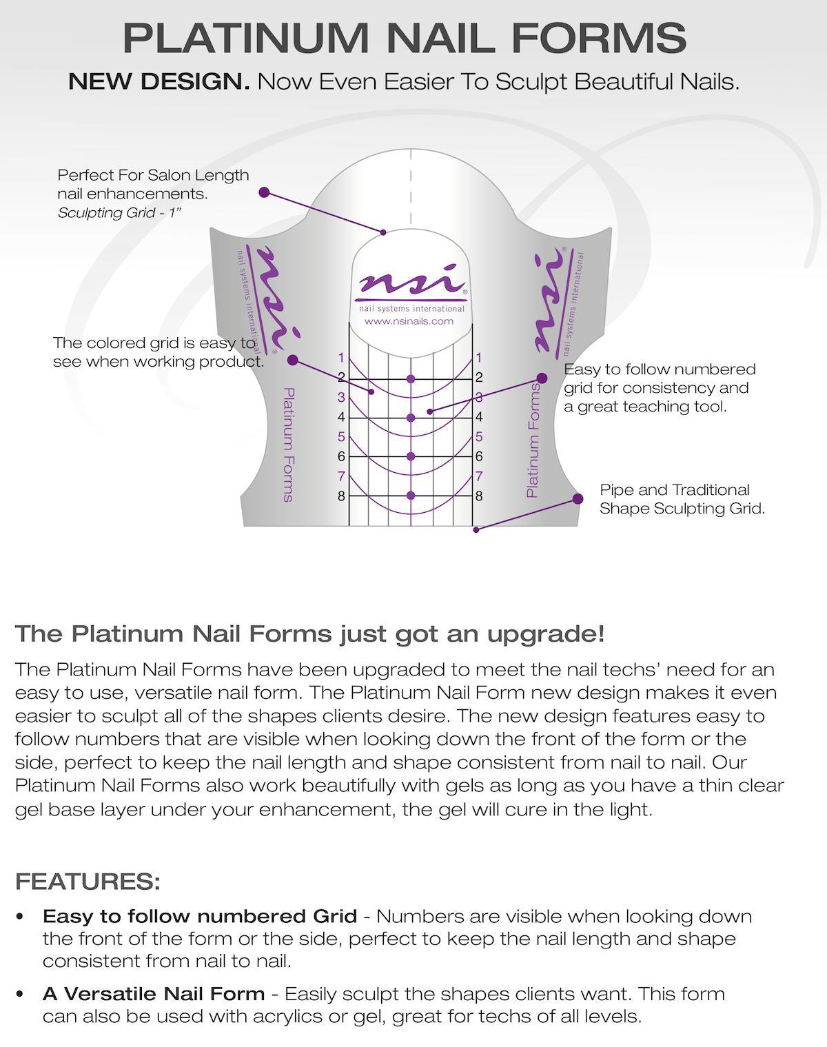 The Platinum Nail Forms are ideal for sculpting acrylic and gel enhancements. The numbered sculpting grid keeps length and shape consistent.