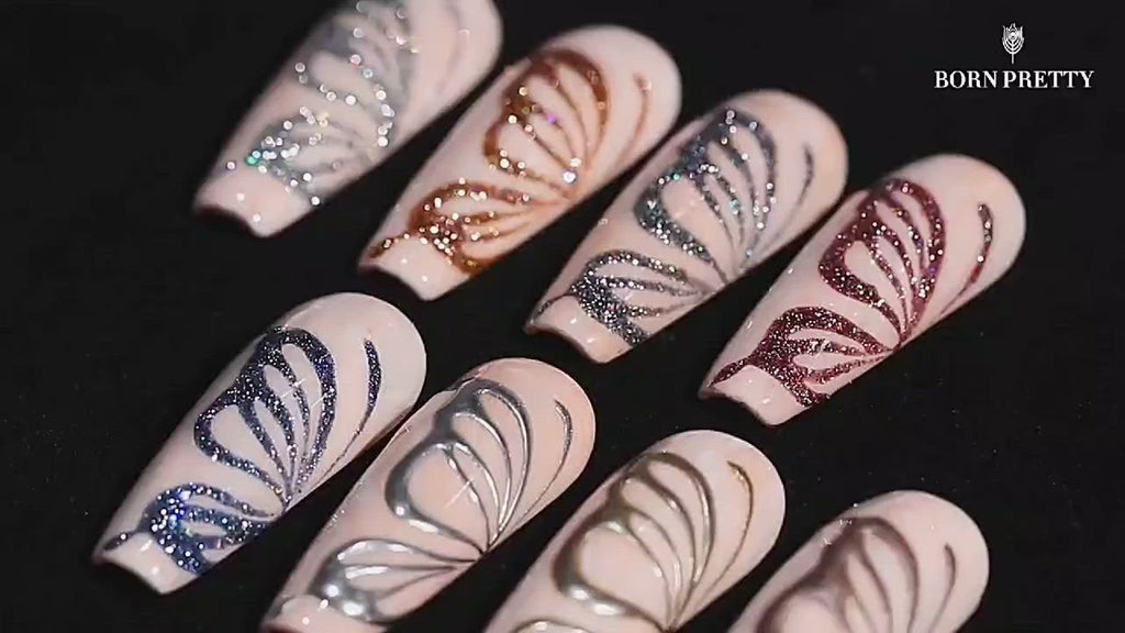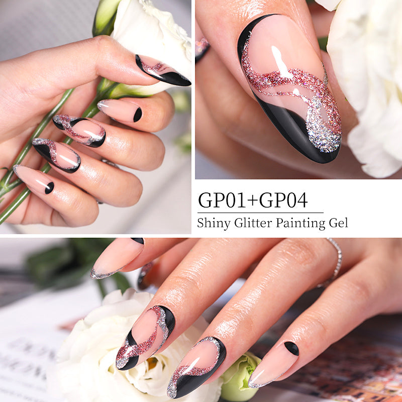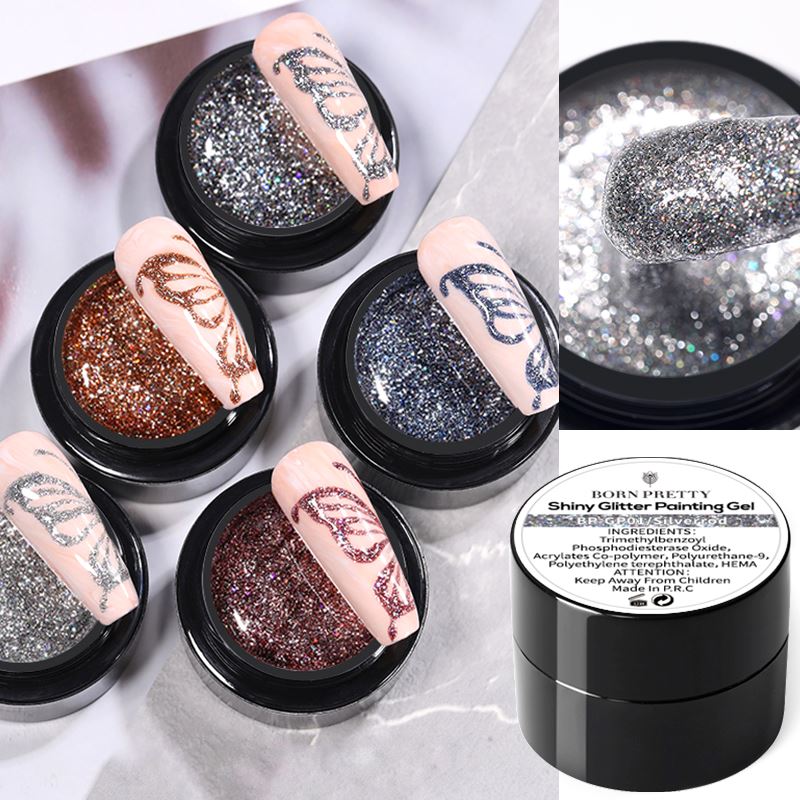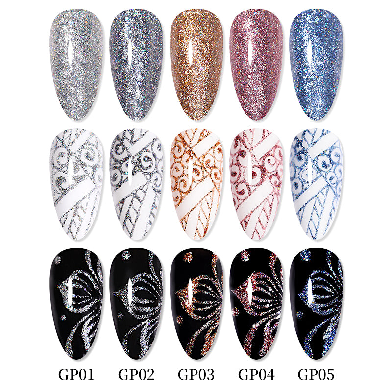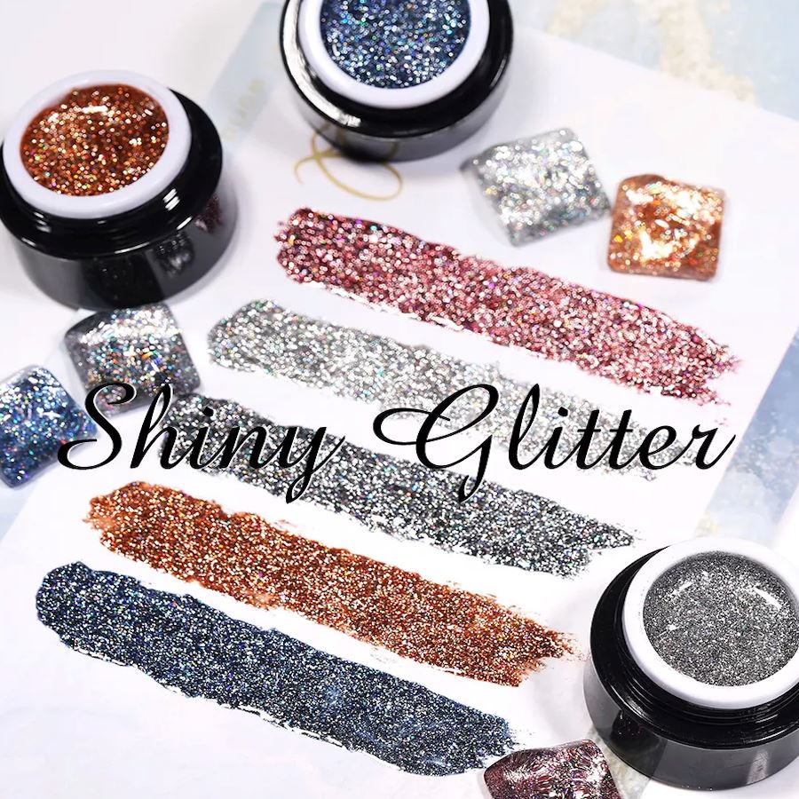 Shiny Glitter Gel Colours in 5 styles to create stunning Nail Art Designs.